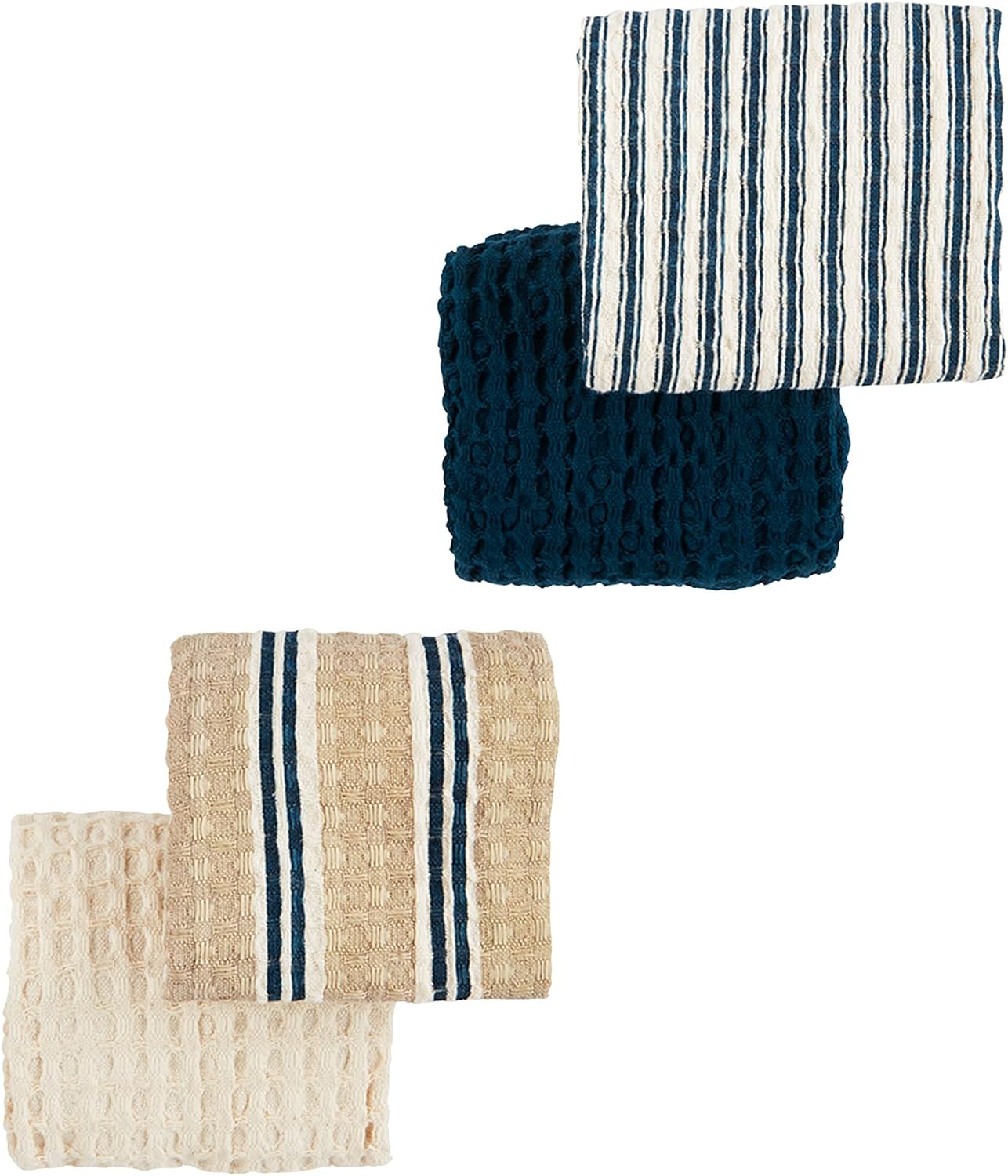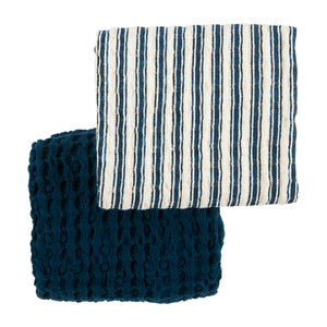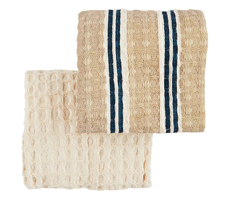 The Mud Pie Bistro Navy Waffle Towel Set is a great neutral set with a nod to a nautical theme! Each set comes with one solid waffle weave towel and one that features a striped pattern.