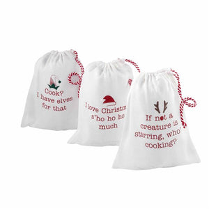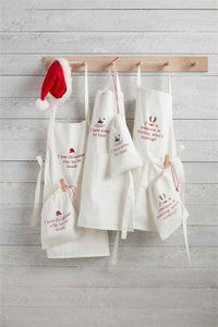 Who's stuck in the kitchen this Holiday season? Why not give them a humorous apron by Mud Pie to keep them smiling while the work. Choose from three printed sentiments on a clean white apron. Each apron comes in a matching drawstring bag!