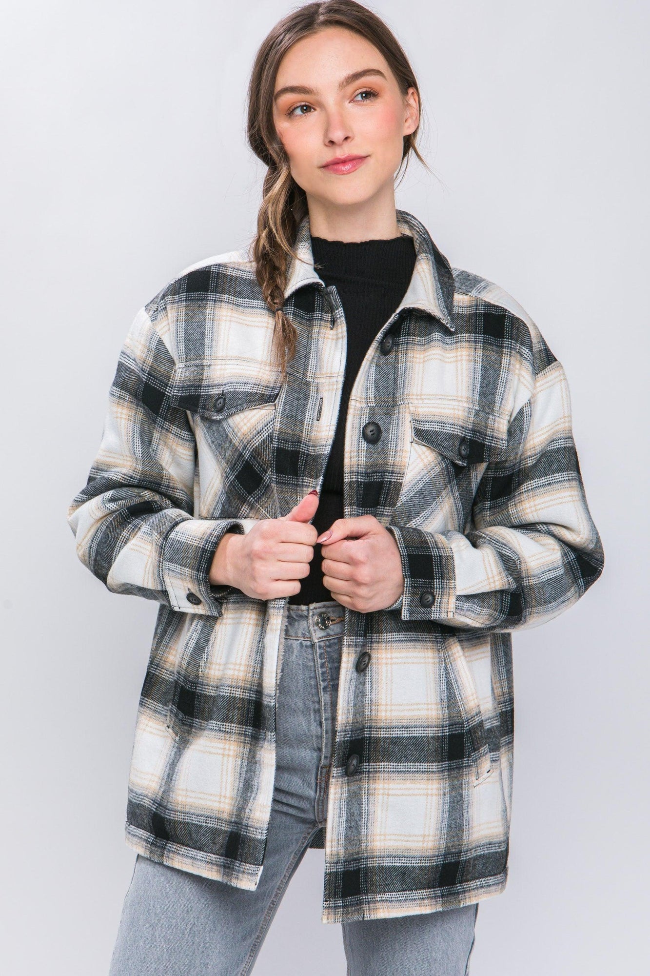 This classic plaid button-up jacket combines timeless style with everyday comfort. The neutral plaid pattern works seamlessly with your existing wardrobe, while the warm sherpa lining provides cozy insulation for cooler months. Practical chest and front pockets keep your essentials within reach, and the rounded hem offers a modern silhouette that flatters various body types. Perfect for layering or wearing solo, this versatile piece is a must for winter!