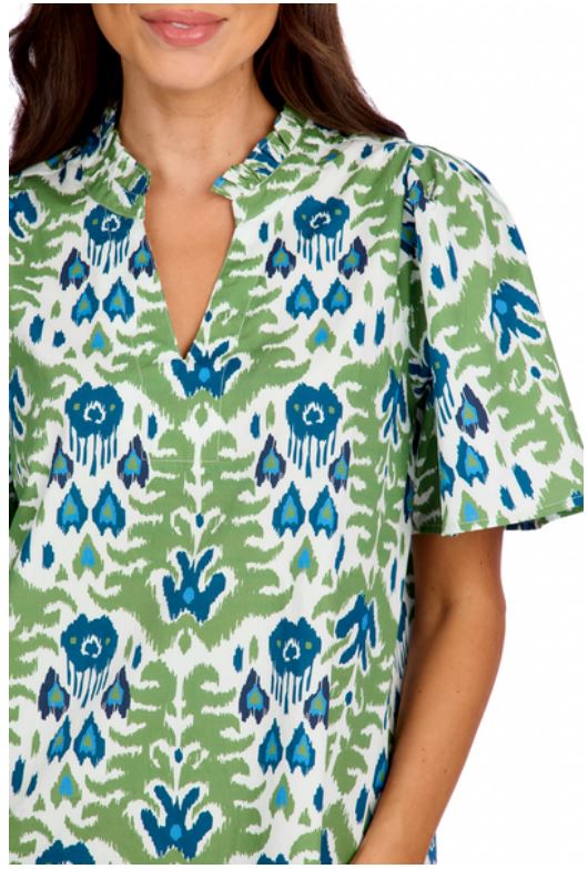 We love the playful and vibrant style of the Mud Pie Chase Flounce Sleeve Top! Made from comfortable cotton poplin, this top features a bold print perfect for the Summer season. This top features a breezy half sleeve and v-neckline with ruffle collar detail. Vacation is calling!