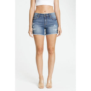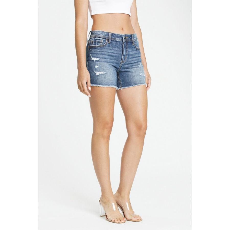 The Eunina Riley Cut Off Shorts are a great option for summer fun. The darker base wash has features whiskering and fading for a more worn look. Moderate distressing on the front, and mild distressing on the back, along with a short fray hem completes your casual style.