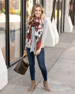 This Fall Floral Scarf by Grace and Lace showcases a bold, over-sized floral print that allows for the rich Autumn hues to really stand out. Super light-weight, this scarf layers great with your favorite long sleeve, topping off a vest, or paired with a denim jacket!