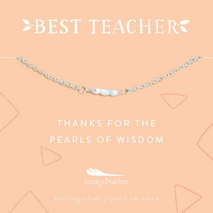 The Lucky Feather Best Teacher collection helps you show your appreciation for that inspirational teacher in your life. Simplistic beauty shines in this triple pearl necklace. Display card features "Thanks for the Pearls of Wisdom" sentiment, reminding her how amazing she is!