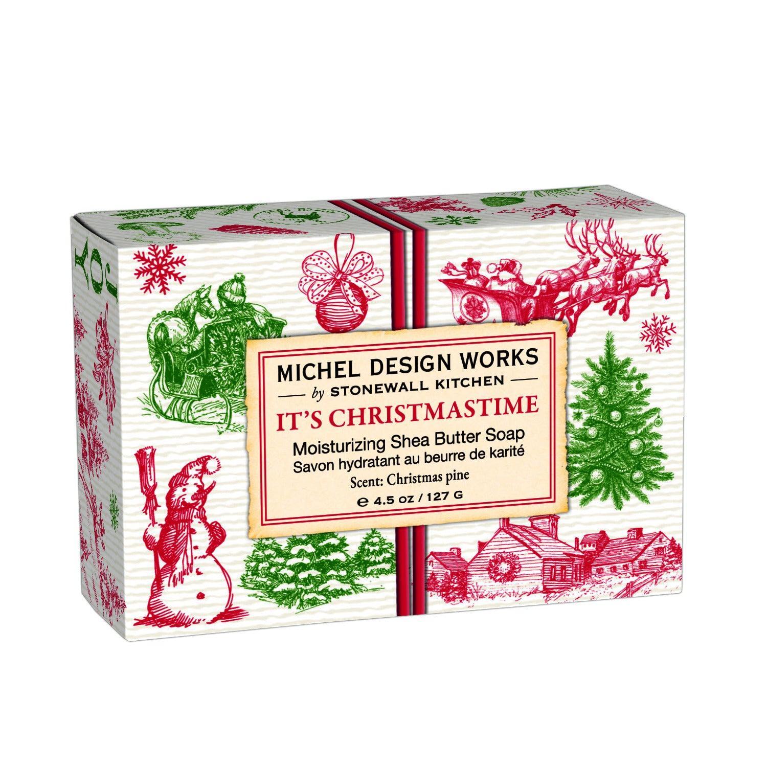 Michel Design Works is known for their beautiful artistry. As part of the It's Christmastime Collection, this Bar Soap showcases nostalgic toiles designs in classic red and green. Reminiscent of a cozy morning gathered around the Christmas tree, this fragrance features the fresh scent of pine with a hints of clove and cedar. Nourishing to the skin, this triple-milled soap is formulated with the highest quality palm oil and hydrating shea butter.