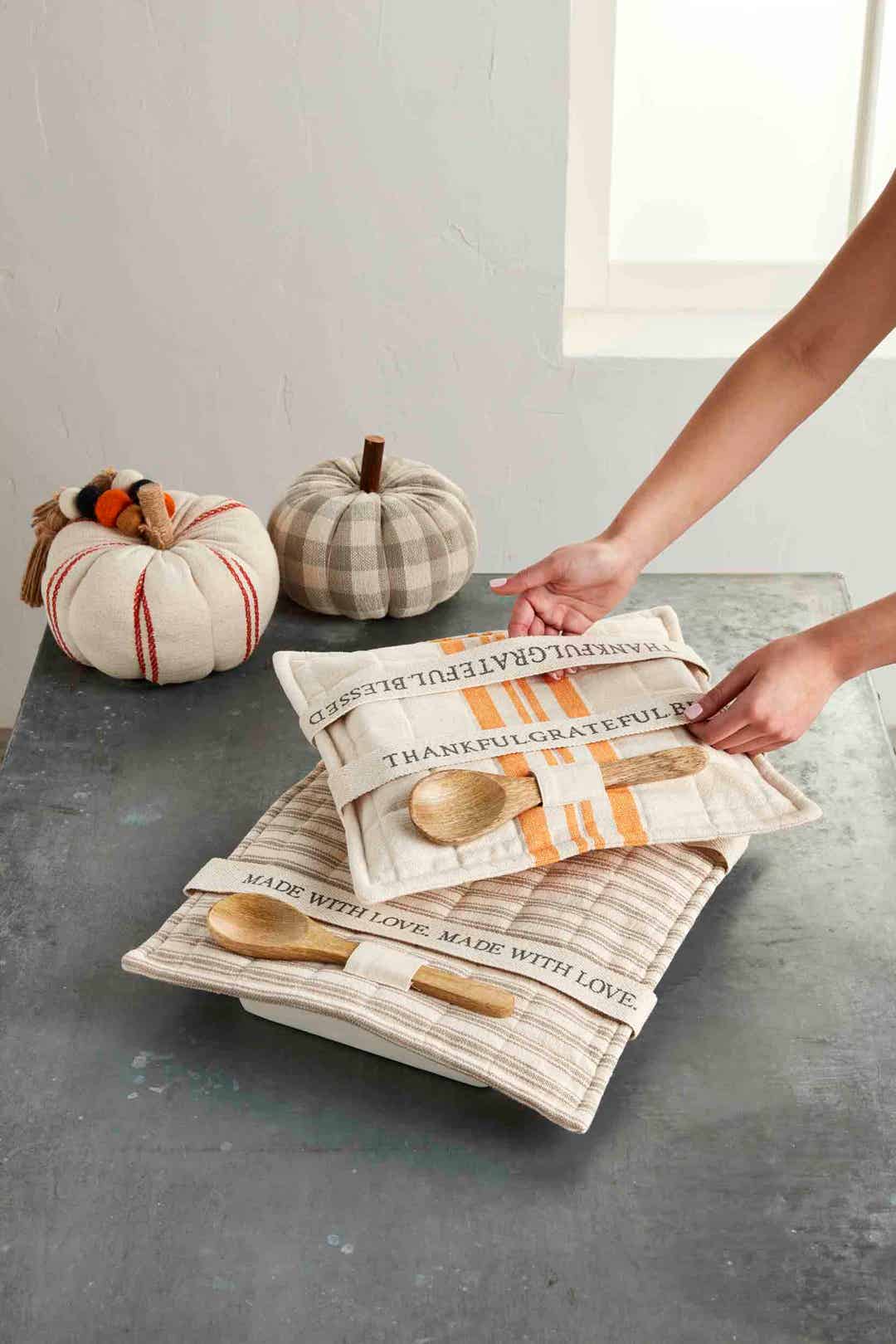 If cooking is your love language, then you need this cute and functional casserole holder by Mud Pie. The quilted canvas holder keeps your dish warm, and can be used as a hot pad when you reach your destination. Slip your dish in through the side zipper and use the top straps for carrying. Complete with a wooden spoon for serving!