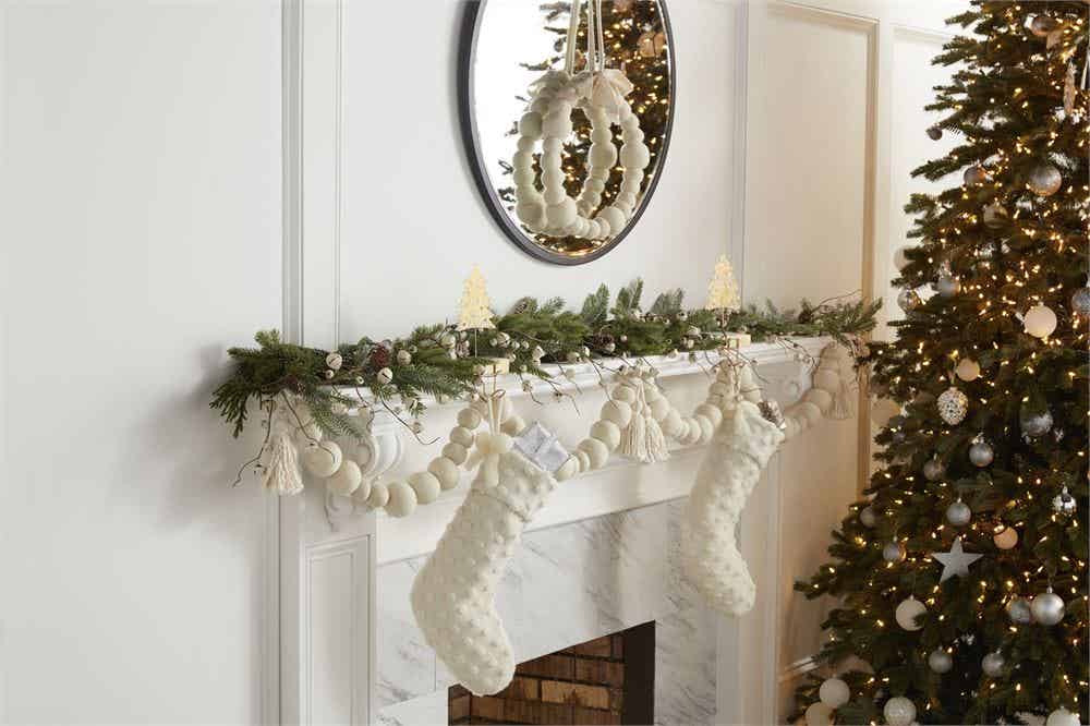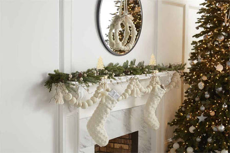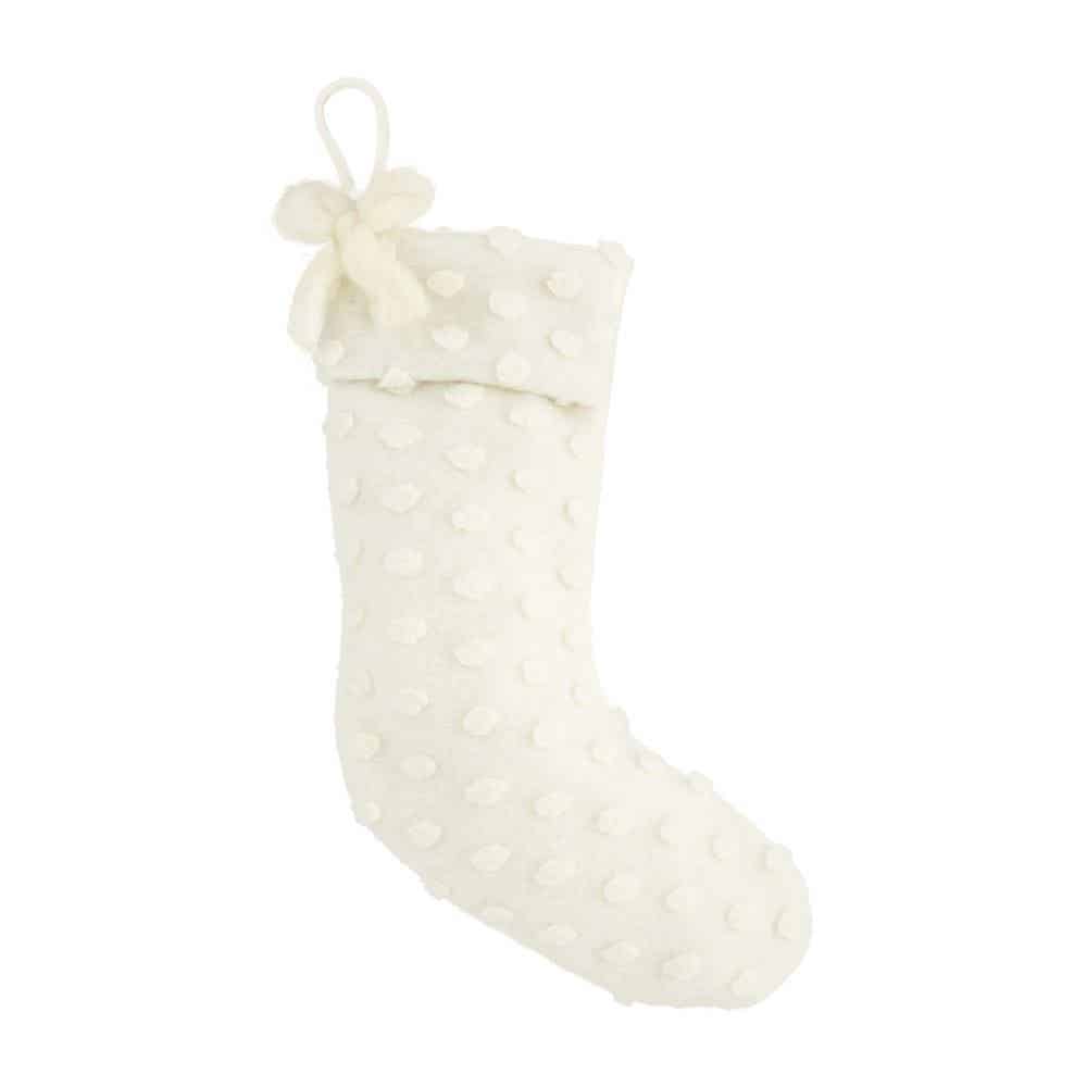 Get ready to stock this White Dot Stocking with the best stocking stuffers. The wool stocking features dimensional polka dots and a loop for hanging. The stocking also features a white bow on the side. This item will be perfect on your home fireplace.