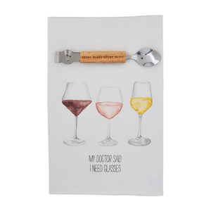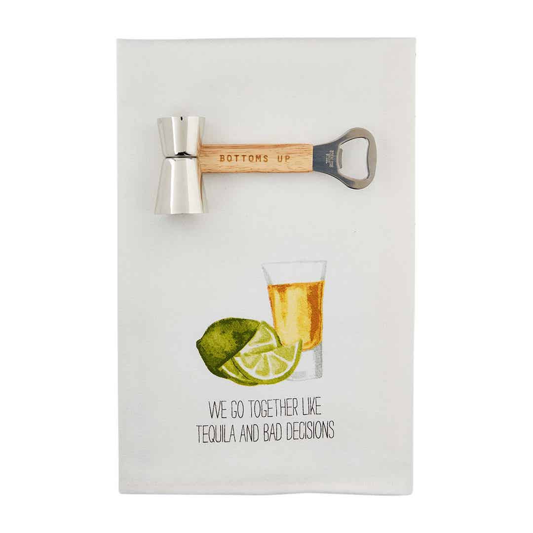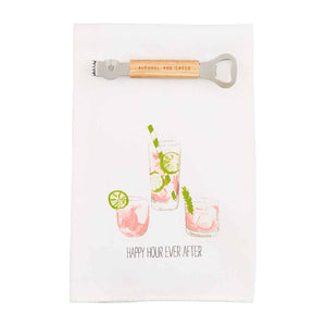 Drink happy thoughts with this old fashioned hand towel set. The printed cotton hand towel features a watercolor style alcoholic image with a punny sentiment. The set arrives with a double-sided metal bar tool with etched wood handle.