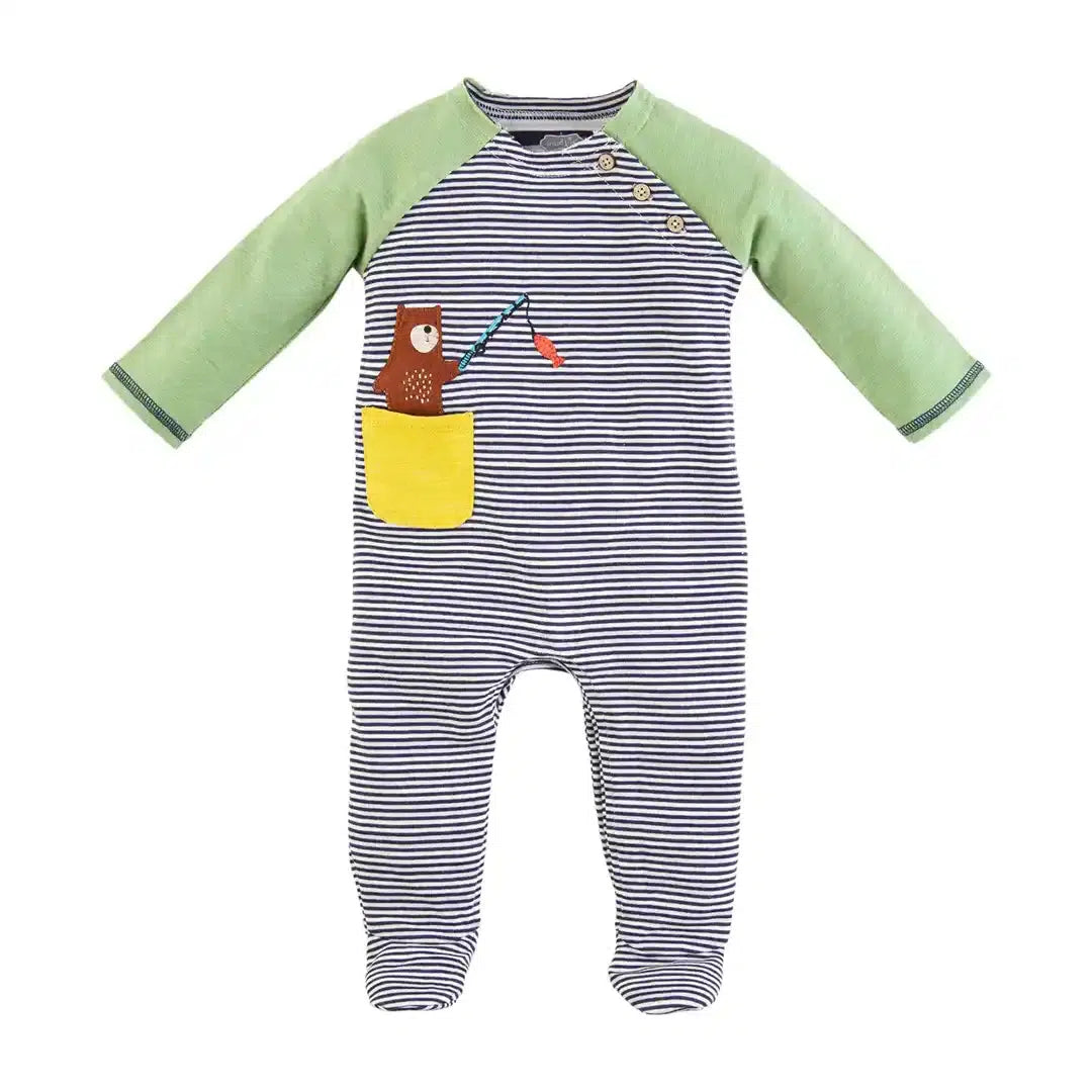 Keep your little one cozy and stylish with the Mud Pie Fishing Bear Baby Sleeper. Made from soft jersey knit with a footed design for added warmth. Featuring a playful fishing bear applique, bright yellow pocket and button details. Inner leg closure make diaper changes convenient. Sleepy time just got more fun!