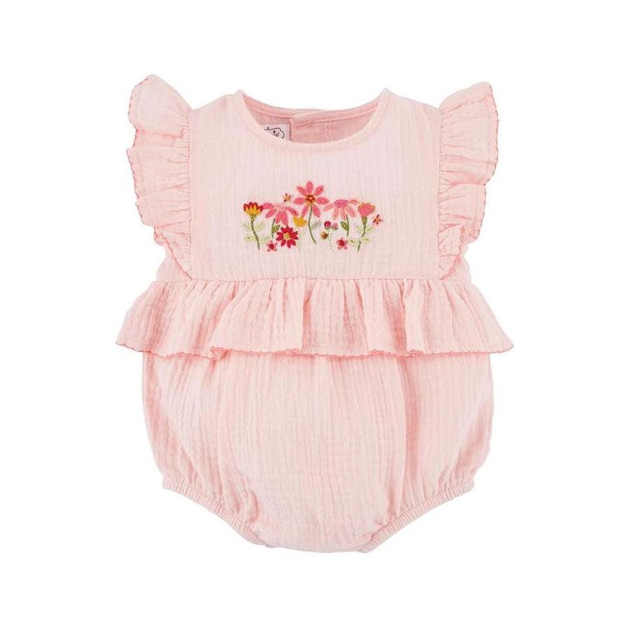 This gauzy bubble bodysuit by Mud Pie is a breath of fresh air for the Spring and Summer months. Ruffle detailing and floral embroidery add a simple sweetness. Three buttons at the back help make dressing easier, and inner leg snap closures allow for hassle free diaper changes.