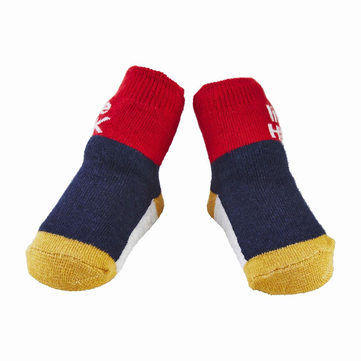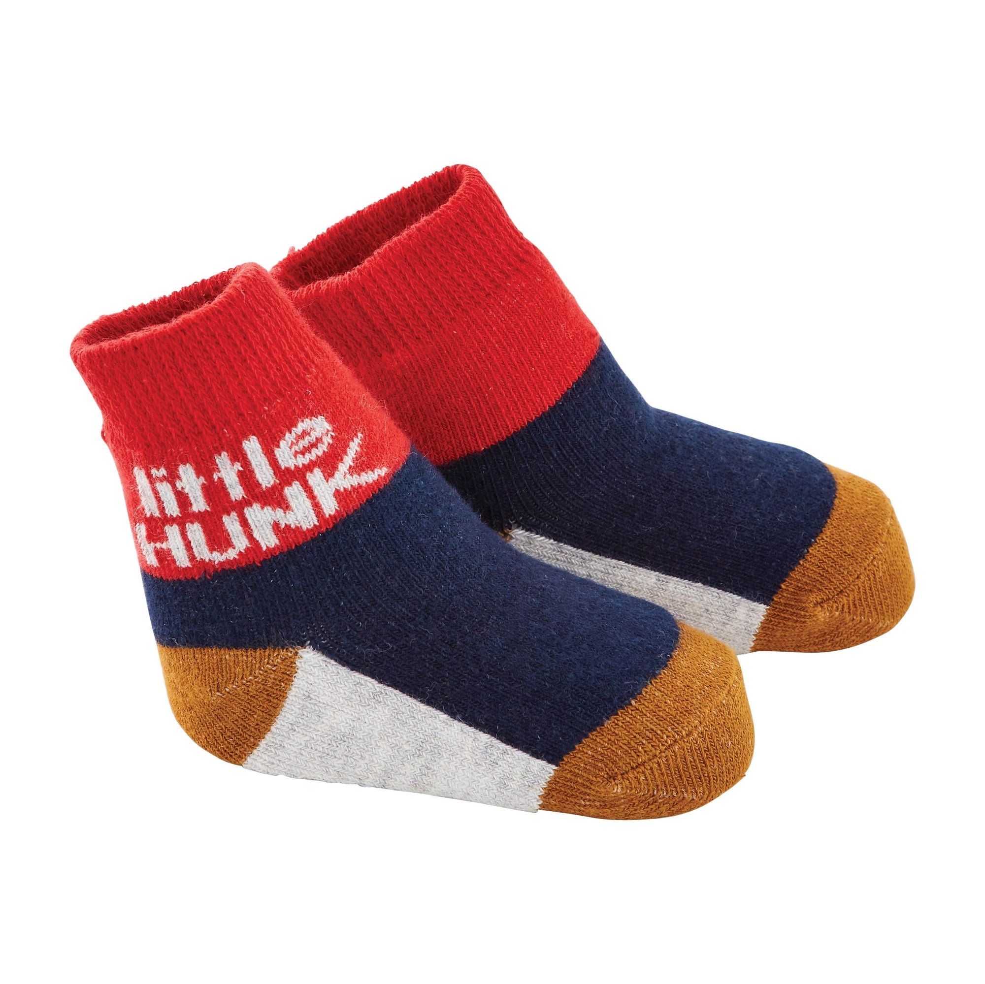 These playful "little hunk" socks from Mud Pie are a great gift for baby boy. The cotton hosiery socks feature a red ankle design that reads "little HUNK" in white lettering. The sock also feature navy, yellow and gray accents. The socks are made from 7.