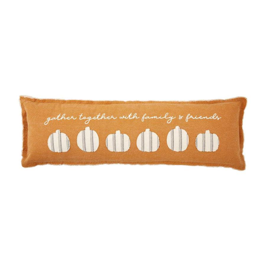 Add seasonal décor to your living space with this Stripe Pumpkin Throw Pillow by Mud Pie. Perfect for couches and entryway benches, this pillow features applique pumpkins and a printed "gather with family and friends" sentiment.