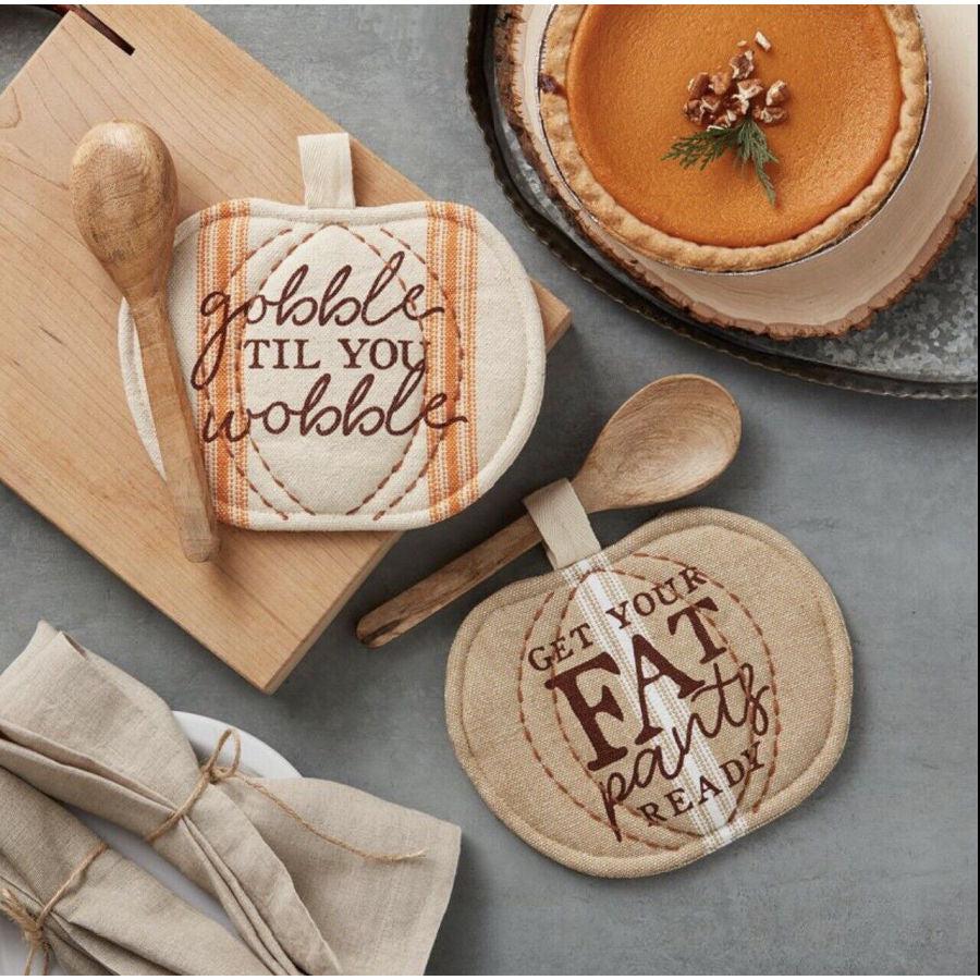 Serve up another helping! These pumpkin shaped potholders feature a feast appropriate sentiment, and come paired with a wooden spoon.