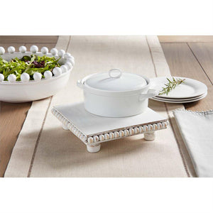 White-washed mango wood trivet features pedestal feet and beaded edge.