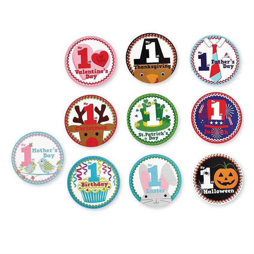Set of 10 removable stickers mark baby's first holiday celebrations. Sticks to and removes easily from any fabric.
