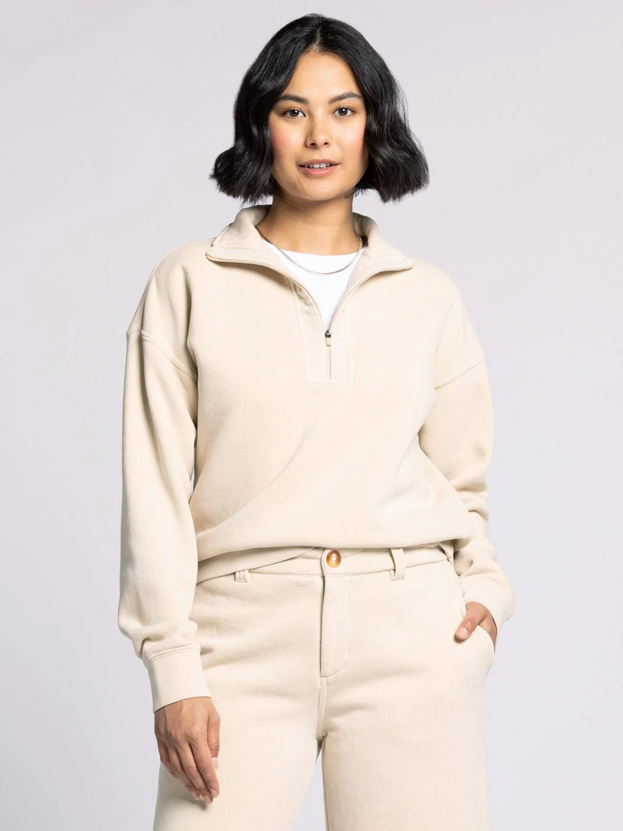 This quarter-zip pullover is your secret weapon for effortless versatility. The relaxed fit provides all-day comfort while the quarter-zip detail adds subtle sophistication. Dress it down with joggers and sneakers for weekend ease, or elevate it with tailored trousers and loafers for a polished look. From casual coffee dates to creative work sessions, this pullover adapts to your lifestyle without sacrificing style or comfort. It also looks fabulous with the matching Mirabel Pants!